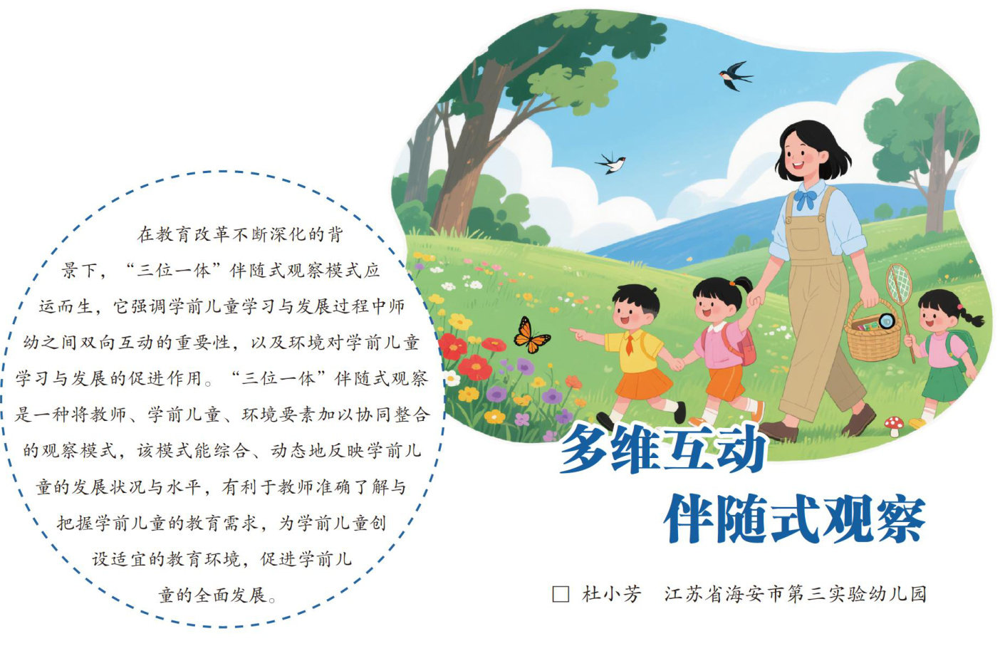 在教育改革不断深化的青景下,“三位一体”伴随式观察模式应运而生,它强调学前儿童学习与发展过程中师幼之间双向互动的重要性,以及环境对学前儿童学习与发展的促进作用。“三住一体”体随式观察是一种将教师、学前儿童、环境委素加以协问整合的观察模式,该模式能综合、动态地反映学前儿童的发展状况与水平,有利于教师准确了解与,把据学前儿童的教育需求,为学前儿童创设适宜的最育环境,促进学前儿童的全面发 “三位一