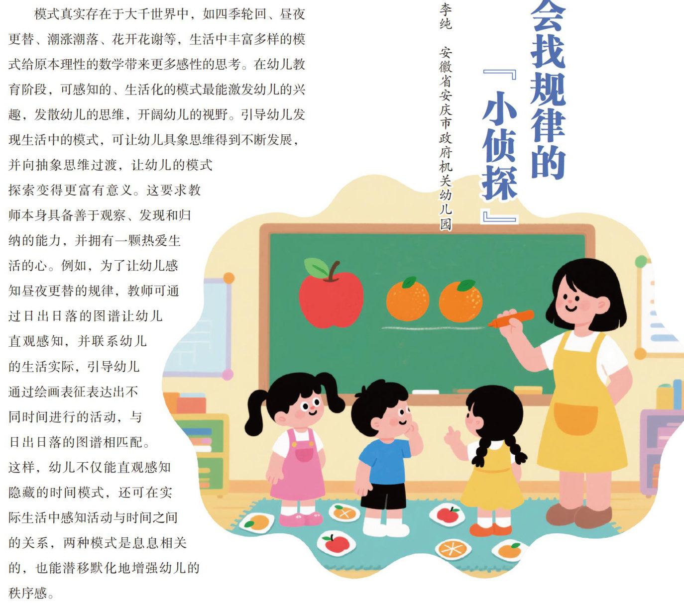 模式是一种有预见性的序列,它能反映客观事物和现象之间的关系,而这种关系是本质的、稳定的且会反复出现的,三个或三个以上的重复模式单元才可构成一个完整的模式。模式存在于各种形式中,包括视觉模式、听觉模式、运动模式、时间模式和数值模式等,具有规律性、重复性、预见性、隐蔽性和多样性。有效发展幼儿对模式的认知,可有效提高幼儿的理解能力、概括能力和抽象思维能力。 巧用大自然中的模式 模式真实存在于大千世界