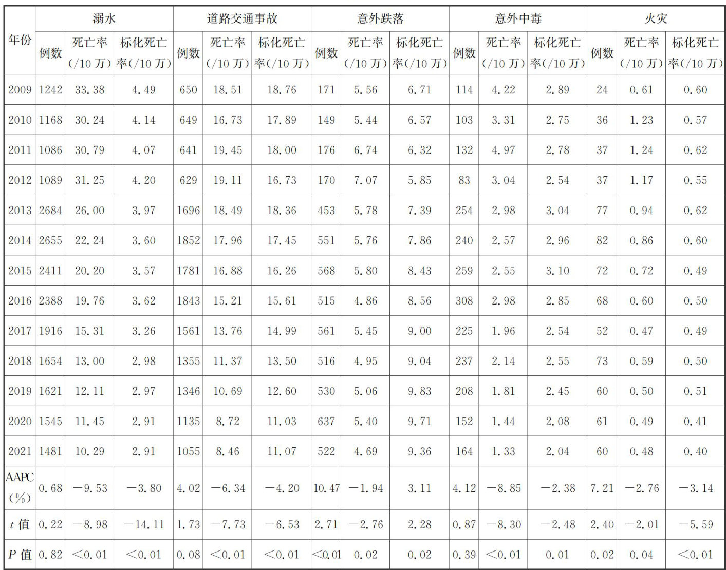 摘要:本研究旨在分析2009—2021年中国 0~14 岁儿童意外伤害死亡的流行特征,为制定相关政策和预防措施提供科学依据。基于《中国死因监测数据集》,采用Joinpoint 回归分析儿童意外伤害死亡率的年度变化百分比(APC)与平均年度变化百分比(AAPC)。结果显示,儿童意外伤害总死亡率从2009年62.28/10万降至2021年25.25/10万( APC=-7.13% P<0.01? ,意外跌落死亡人数呈上升趋势( APC=10.40% P<0.01? ;男、女童及城乡、东中西部地区死亡率均下降,且男童死亡率下降速度显著快于女童,城乡死亡率差异有统计学意义( P< 0.01)。而意外伤害是 0~14 岁儿童死亡的主要原因,虽死亡率呈下降趋势但仍处较高水平,需强化该年龄段儿童意外伤害的防控措施。