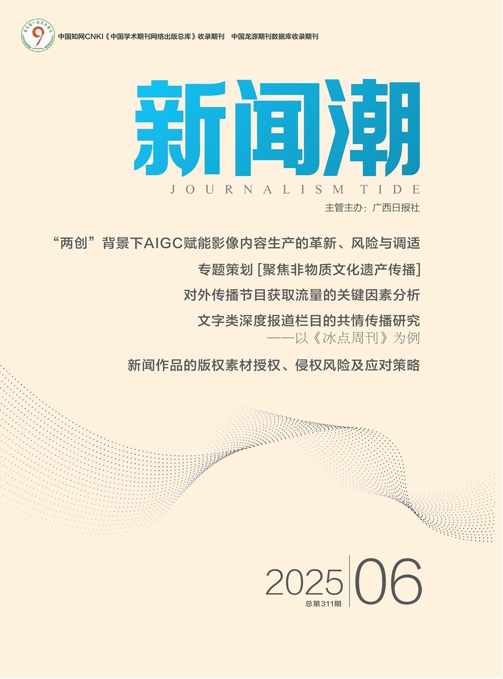 《新闻潮》杂志 Journalism Tide 主管单位、主办单位:广西新闻学会,广西新闻工作者协会 新闻业务刊物。针对新闻界的思想动向与新鲜事物发表意见,介绍新闻业务知识,交流实践经验,研究新闻史料,介绍中外名记者、名编辑等专业人员的成才之路,介绍国内外新闻理论、采访经验及新闻界动态。