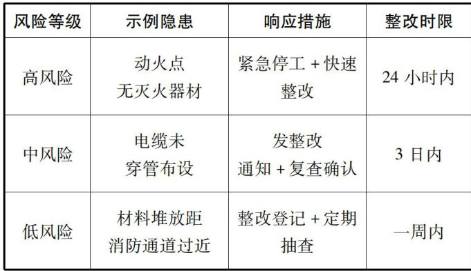 摘要:建筑工程施工阶段的火灾隐患呈现高频发、多样化、隐蔽性强的特征。本文通过对典型施工现场火灾事故的原因剖析,明确了易燃材料堆放不规范、临时用电布置杂乱、动火作业管理缺失以及人员消防意识薄弱等关键隐患点,并在此基础上构建了融合风险分级、动态巡查与信息化监控的排查方法体系,结合移动终端巡检、视频监控联动和火情预警机制,有效地提升了隐患排查的精准度和响应效率,为施工防火管理提供了有力的技术支持。